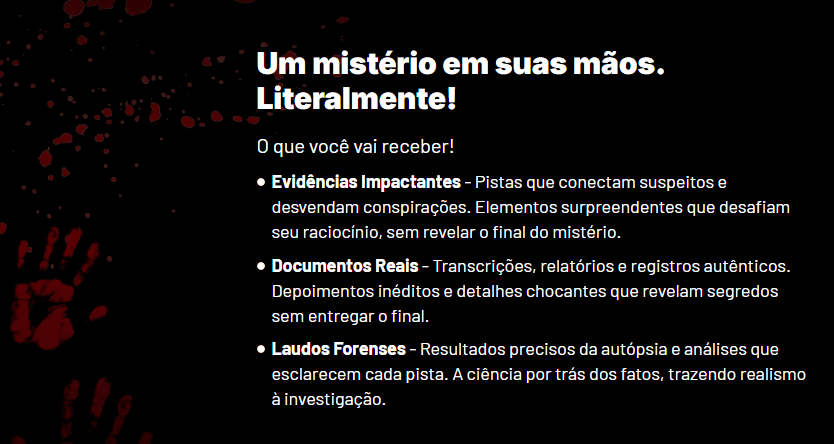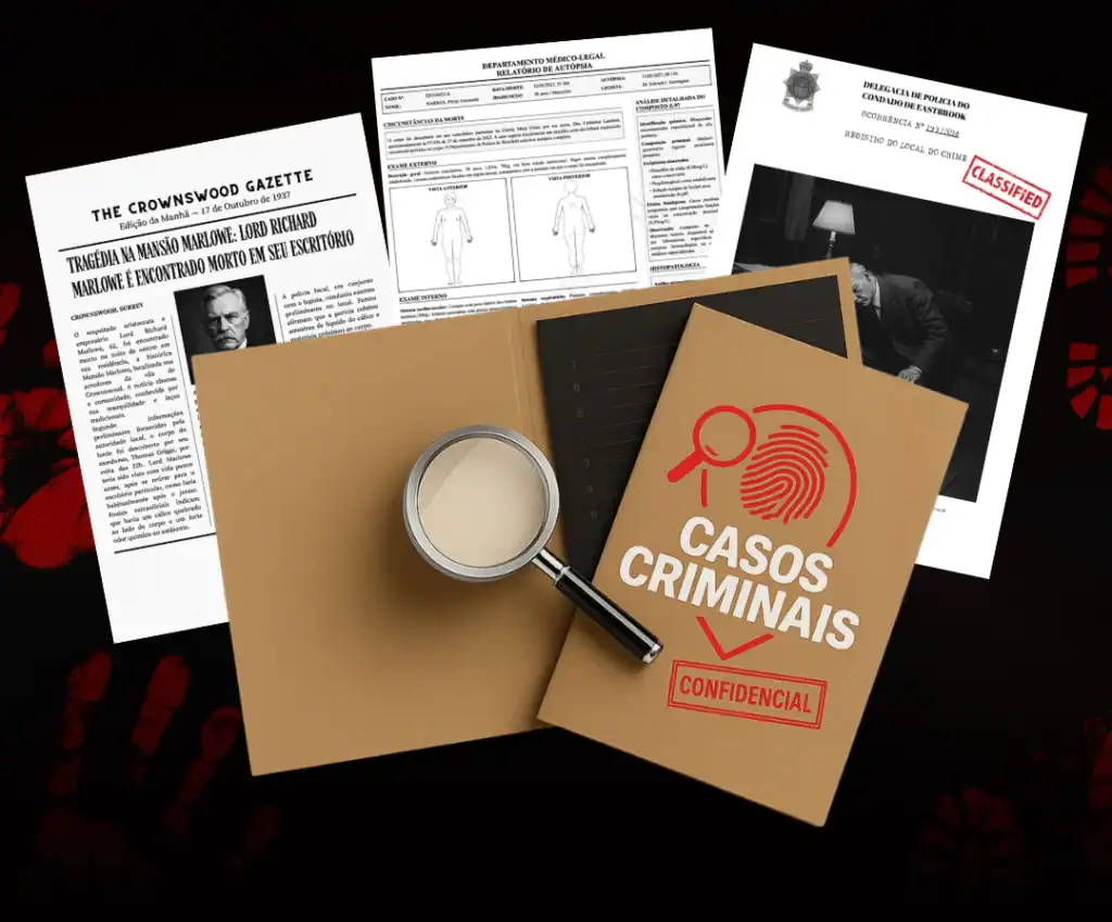 Cada dossiê apresenta pistas e evidências que testarão sua lógica e habilidades de detetive. Analise os detalhes, conecte as informações e desvende cada enigma.